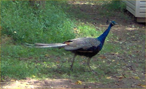 On 9/9/09, my mother called me at work to say that there was a peacock on our land. She named him Fifi. He had molted so he could not fly. We tried to herd him in to a cage with no luck. He then left. Here are some photos that my mother took. He was never seen again.