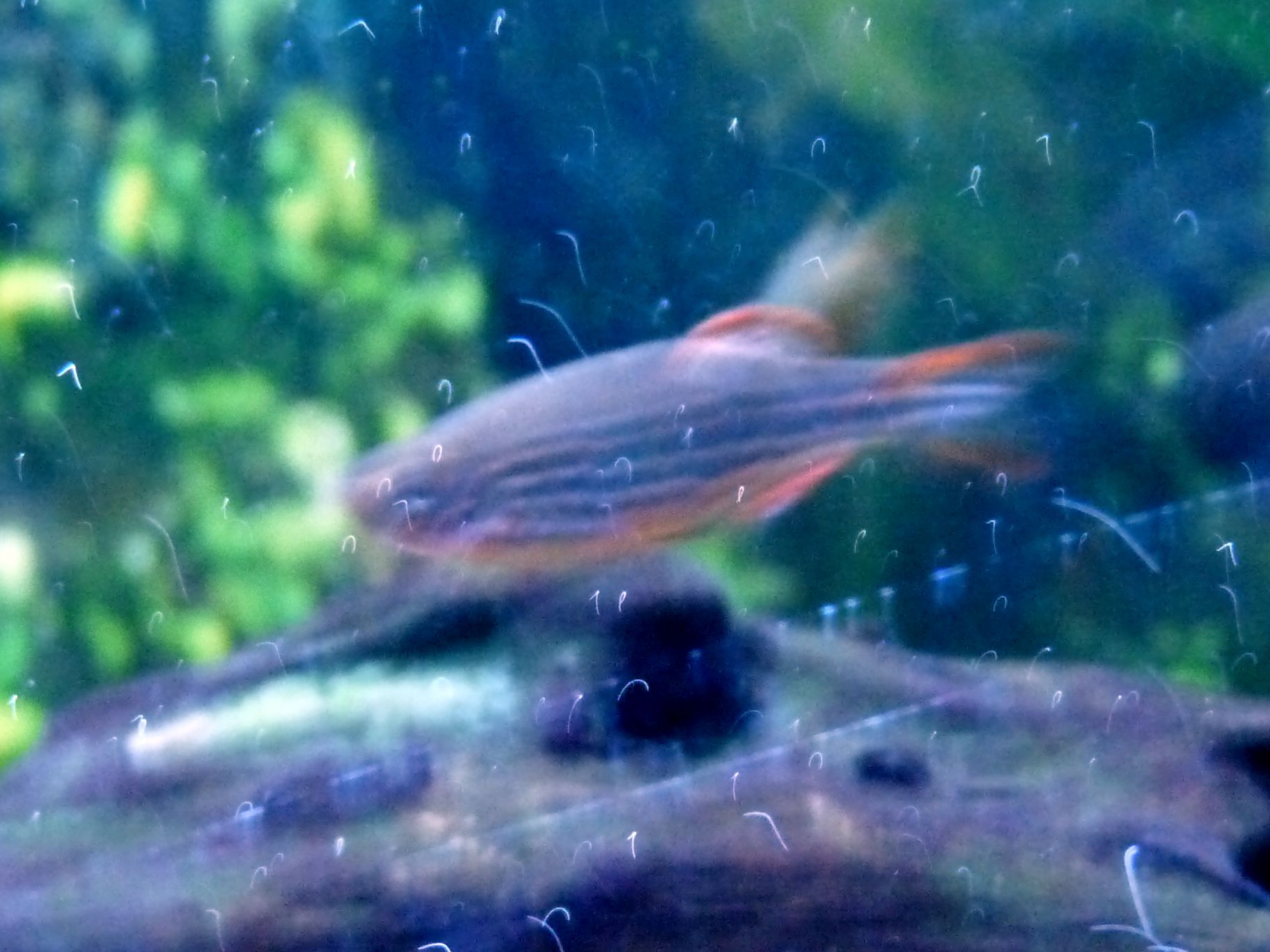 Bad picture of my danios taken 9/27/98. On the left, there are four fish down the tank. The top fish is a male longfin leopard danio. The second fish is a female longfinned albino (or orange) zebra danio.