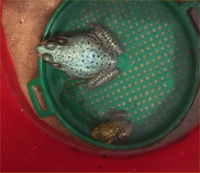Here are photos of 9 green frogs, 3 wood frogs, and 2 pickerel frogs waiting in a bucket while I