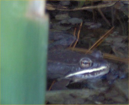 Rana sylvatica, the wood frog, is a frog that only spends time around water during breeding. They grow to about 2 to 3 inches. I bought a few tadpoles to add to the pond in 1997. In the summer of 1998, I thought I saw an adult but I had a 100% sure sighting in early July, 1999 of a full grown adult wood frog who posed for photos (he was too small for me to scan them in). I saw a young adult in the pond a few weeks later. They are brown, cute, and skittish. Wood frogs are diurnal (active during the day) but seem to call mostly at dusk. The males quack in early spring to breed. After breeding, adults may venture far from water in the woods. The wood frog is the only North American frog that breeds north of the Arctic Circle. They hibernate on land and can freeze solid in winter and live.