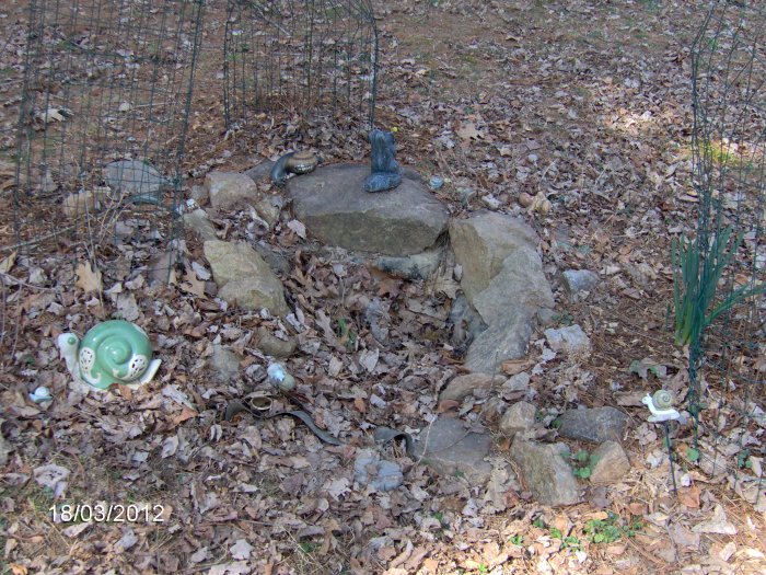 I demolished this pond on 3/18/12. There was almost no water in it, just a lot of leaves. I pulled out the rocks and liner. I bought a new liner a few years ago and had to decide if and where I might build a replacement for this pond. At that time, there was a drought so digging was out anyway. I dug the new pond on 5/8/12 and used some of that dirt to fill in the hole where the old pond used to be.