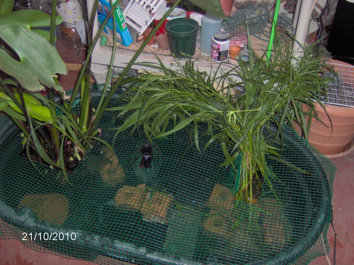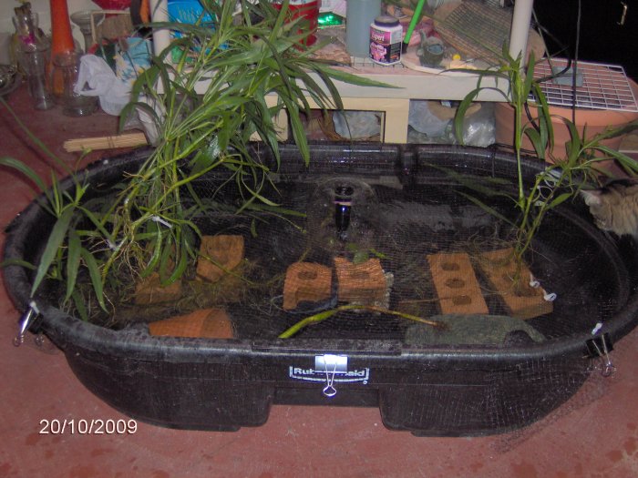 I set up the 50 gallon Rubbermaid tub basement pond on 10/20/09. Here are those photos: