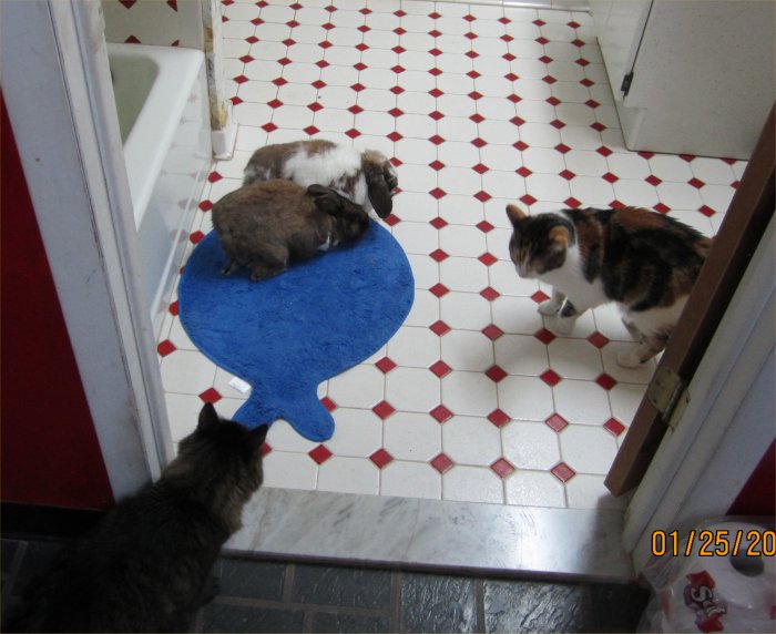 On 1/25/14, I had my two rabbits out together, and cats Emmy and Tinkie showed up to check them out. Harry is