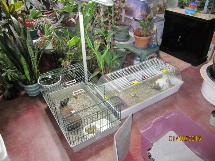 I brought Harry in on 1/7/15 because it was going down to 7 degrees F that night. His eyes were in bad shape so I started his eye medication again. He had a lot of poop on his rear. He was very grumpy (grunting a lot). He is not in great shape. Even though the cage is about a third of the size of the hutch, I decided to keep him indoors permanently. On 1/10/15, I gave both boys butt baths and cleaned both of the buns' cages and moved them next to each other with the full spectrum lamp that Mr. Tiny has been under. So, they are sort of together. I did not want to make a larger cage and put them together in case they hurt each other. Plus, I could not tell who did what and ate what if together all of the time. With their poopy butts, they have to have the entire cage covered in CareFresh which is messy and expensive.