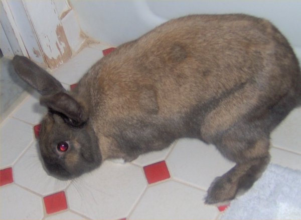Once I got Harry, I examined him. He is about 3 pounds. Harry is a semi-dwarf rabbit but not a Netherland. He is probably a mixed breed. His fur is a slightly brindled chocolate with white patches on the chest and legs in an uneven pattern. His ears are slightly lopped so he may have some lop in his genes. His coat, ears, eyes, teeth, and anal glands all seem fine. He has a round stomach so I do not know if it is bloating or just a lot of food since my relative was feeding him some pellets and hay the week before I got him so he had to stock up. I gave Harry a bath to remove the yellow stains on his feet and clean him up. I trimmed his nails. They were sharp but not too long since he is still a baby. One dew claw was just starting to become ingrown.