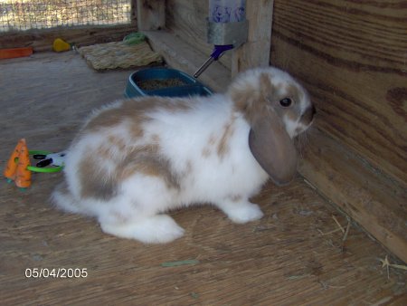 On 2/27/05, my mother was feeling down since our dog, Schmoo, died the month before and four other animals were in poor health or dying outright (cat Samantha - old, decrepit, kidney failure; cat Elvisina - feline hyperthyrodism, some unknown virus, bad heart; hedgehog Sonic - dying of cancer; and rabbit Isabella - completely disabled and in really bad shape) so when she went into a pet store, it was almost inevitable that she would come out with something! She impulse bought an itty bitty lop. When she showed "her" to me, I said, "She's so tiny....Miss Tiny." For wont of something better to call her, that was "her" name for then. "She" was about 8-weeks-old the store said, placing "her" assigned birthdate to be 1/2/05. [The store, my mother, myself, and the vet were all wrong about the sex. Miss Tiny is Mister Tiny. See below. I will switch to masculine now for him (I had to alter all the text).] He was brown and white. They said he was a mini lop but he looked too small so I think he was a dwarf lop or Holland lop (the vet later agreed). He seemed okay except a little nose discharge (what rabbit does not have that?), and one of his left front nails had a glob of scab so it must have broken off (note the vet said it would grow back but it never did). I trimmed his nails the day we got him but they were so itty bitty that even though they were sharp, there was not much to cut. My mother put Mister Tiny on her bed, and he came and licked her face. He loved kale, probably his first vegetables. Unlike most buns, he liked to climb. He had a ramp. On 3/4/05, he went to the vet, and he said he was perfect (and they all fell in love with him). He weighed just 444 grams. By comparison, my guinea pigs were 1035 and 1237 g the same day at the vet. He was Tiny!