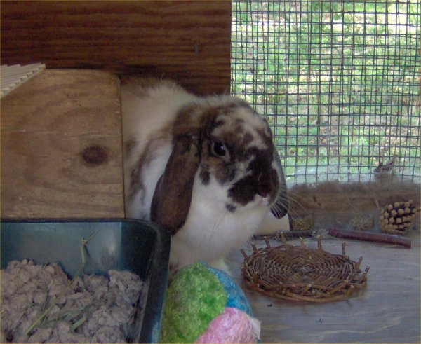 On 4/2/05, I moved Mister Tiny out to the right side of the rabbit hutch. He had gotten a chubby little tummy but was still extremely spry. He loved to jump and climb so I mounted his metal balcony in the hutch. His cage inside was a tiny 25" x 15" while the hutch room was 35" x 39" which was 3.6 times bigger. He seemed to really love it. He kept moving the full size cat litter pan of CareFresh in there about so he was very strong! He was still tiny but maybe three times heavier. Update 4/20/05 - He was doing great!!!!!
