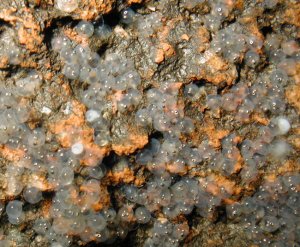 Eggs - this is a closeup of a few of the developing eggs. You can see the fry's eyes. If you were there, you could see the fry spin around in their eggs!