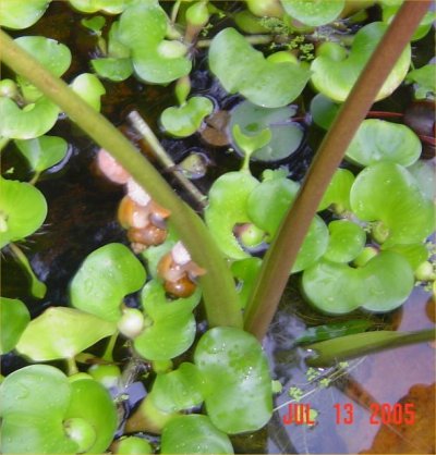Sharon sent photos of apple snail eggs in her pond on 7/7/05: snail eggs and close-up of snail eggs. She then sent a few photos of the yellow apple snails actually laying the eggs on 7/13/05: two apple snails and three egg cases and two apple snails and three egg cases again from another angle. Water hyacinth is on the pond's surface.