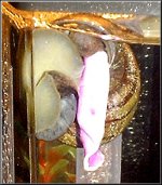 On 2/1/02, I bought my first "mystery snail" labeled as an albino mystery snail. His name was Snaily. Snaily went into my 20 gallon tank to eat algae off the glass. My pleco was too large to get much algae off the glass anymore. By checking out applesnail.net I thought I determined that my "albino mystery snail" was Pomacea bridgesii or the spike-topped apple snail. You can see their page on this species here including lots of photos and info! My new snail decided to eat all the plants in my tank. Later, the webmaster of applesnail.net informed me that my snail is not P. bridgesii but in fact P. canaliculata which explains why he did not behave like P. bridgesii is reported to behave.