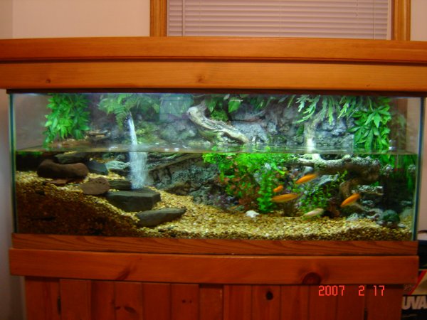 As of 12/14/10, I have gotten at least a half dozen people asking where they can get the backdrop used in the photos above. Mike (Haywood) replied with this on 4/6/08. "I wish I knew where to still get them; I need a new one. I bought it at PetSmart about 10 years ago. They no longer sell it and couldn't help me when I asked about it. I did some research about a year ago and the closest thing I could find was called the 'The Habi Scape.' They don't have a 55 or 75 gallon size so it's no good for me but they do have other small sizes. That's the closest thing to it I could find. If you ever end up finding it PLEASE let me know." This web page has instructions on how to make your own 3D rock background: DIY Aquarium Background.
